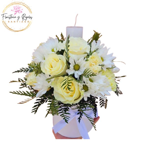 BOX DE 8 ROSAS, MARGARITAS, FOLLAJE Y VELON