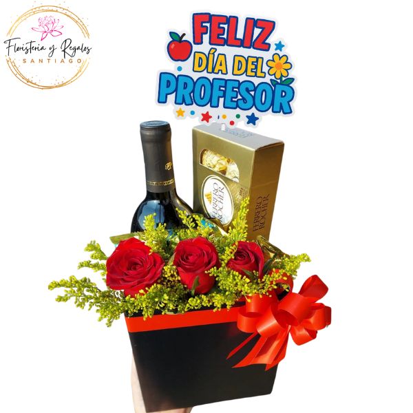 BOX DIA DEL PROFESOR CON 3 ROSAS, FERREROS ROCHER 100GRS, VINO 375ML Y TOPPER