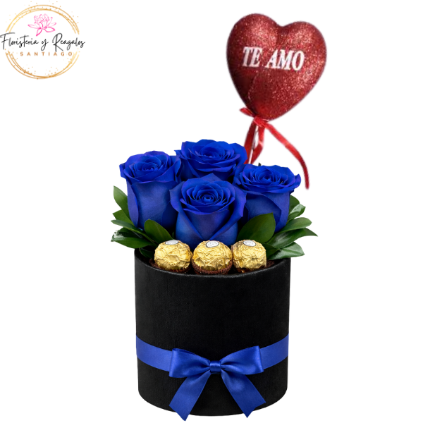 BOX PARA ELLOS CON 4 ROSA AZUL, 3 BOMBONES FERREROS ROCHER Y TOPPER