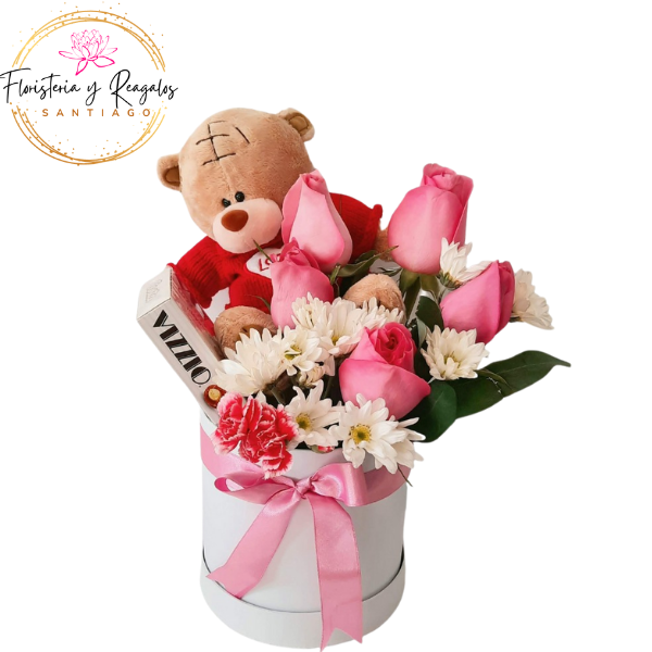 BOX REDONDO 5 ROSAS PELUCHE 20 CM Y BOMBONES VIZZIO