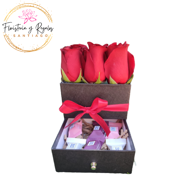 CAJA BOMBONERA DE 6 ROSAS IMPORTADAS Y 6 BOMBONES