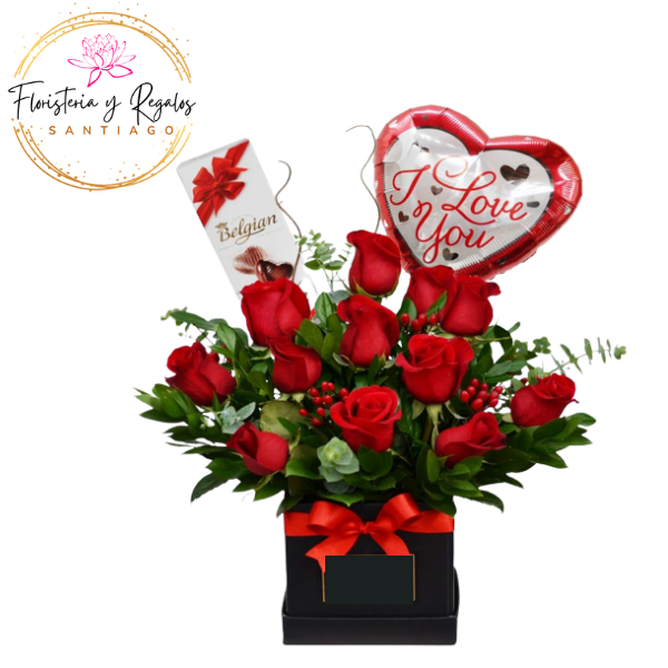 CAJA BOX DE 12 ROSAS ECUATORIANAS, BOMBONES Y GLOBO