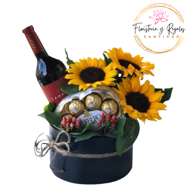 CAJA BOX DE 3 GIRASOLES, VINO Y BOMBONES