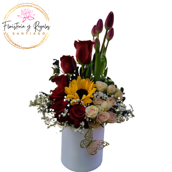 CAJA BOX DE 6 ROSAS, GIRASOL, 5 TULIPANES Y FOLLAJE