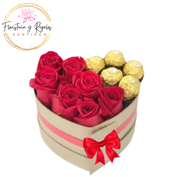 CAJA CORAZON DE 10 ROSAS, 3 GIRASOLES Y 5 BOMBONES FERREROS ROCHER
