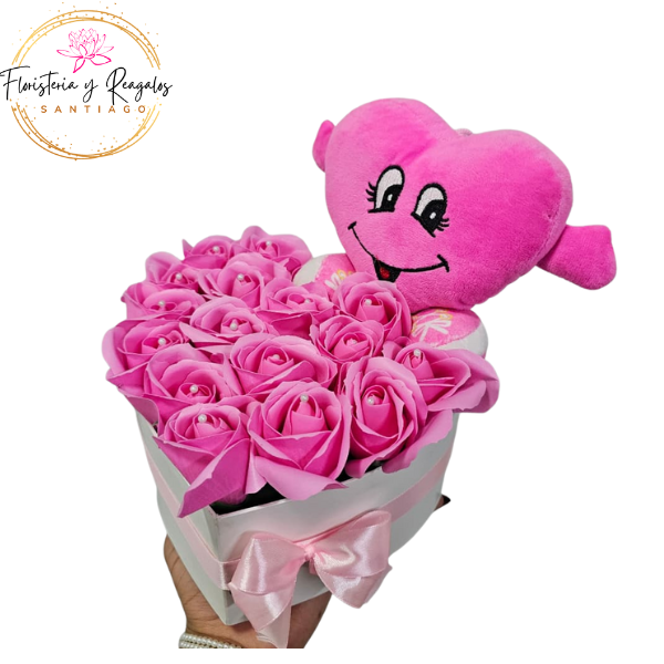 CAJA CORAZON CON 17 ROSAS JABON Y PELUCHE CORAZON 15CM