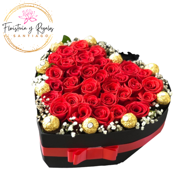 CAJA CORAZON DE 30 ROSAS Y 10 BOMBONES FERREROS ROCHER