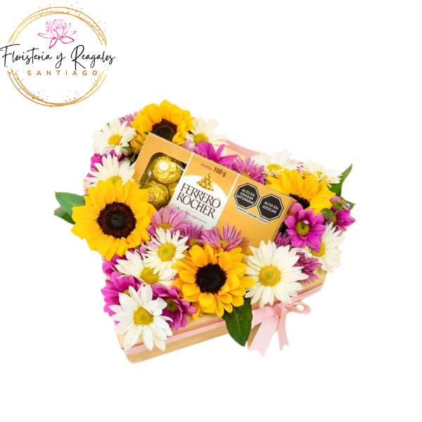 CAJA CORAZON DE MARGARITAS 4 GIRASOLES + FERREROS ROCHER 100G