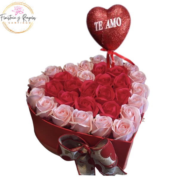 CAJA CORAZON TE AMO DE 30 ROSAS JABON Y TOPPER