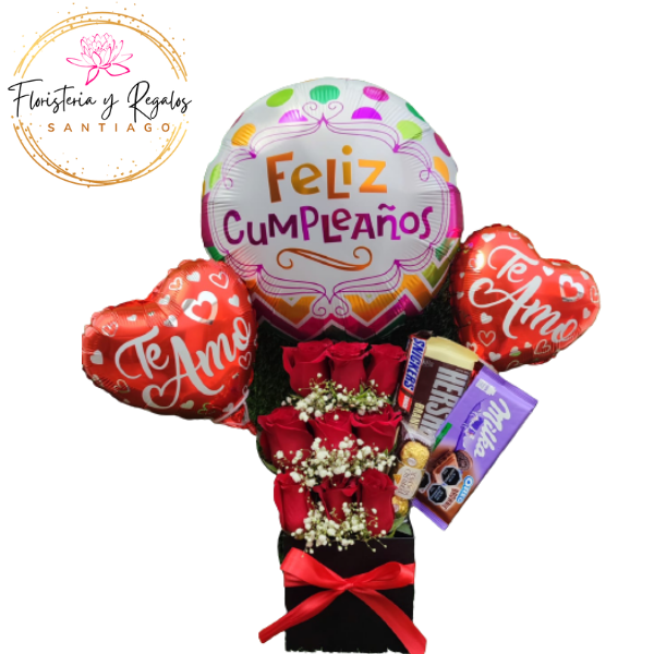 CAJA CUADRADA 9 ROSAS LINEAL + GLOBOS 2 CHOCOLATES IMPORTADOS 2 CHOCOLATES NACIONALES