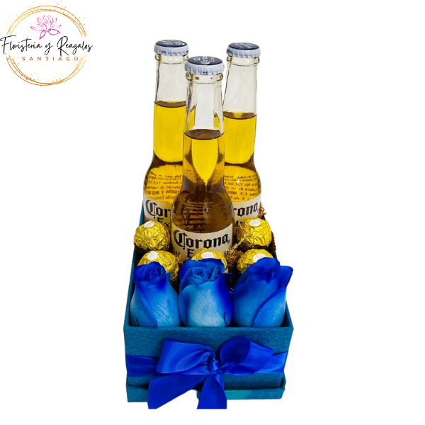 CAJA RECTANGULAR DE 4 ROSAS AZULES, 4 GIRASOLES, 4 BOMBONES Y 2 CERVEZAS
