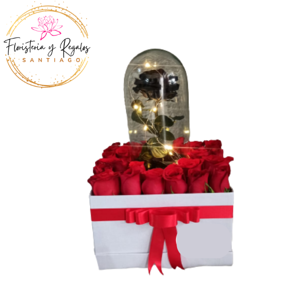CAJA DE ROSAS NATURALES CON CUPULA DE ROSA PRESERVADA Y LUCES