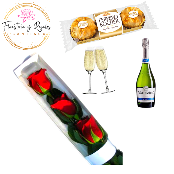 CAJA VISORA DE 3 ROSAS FERREROS ROCHER DE 3 UND + CHAMPGNE 375ML + COPAS
