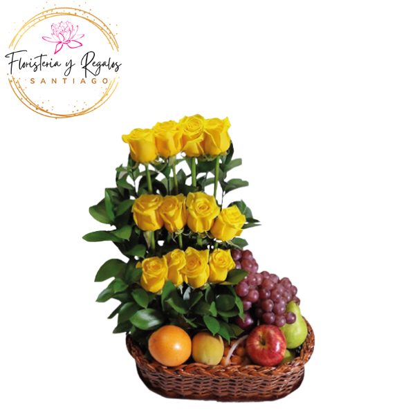Arreglo Con frutas de temporada y arreglo floral de 12rosas