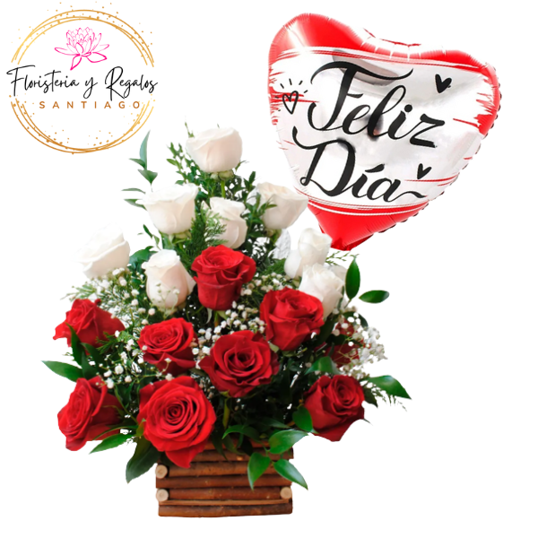 InicioDIA DE LOS ENAMORADOS MUJER CANASTA DE 15 ROSAS, FOLLAJE Y GLOBO