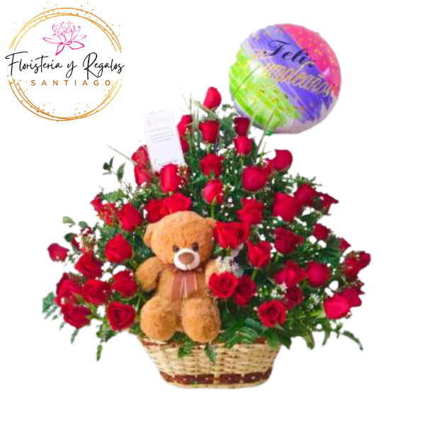 CANASTA DE 40 ROSAS + PELUCHE DE 35CM + GLOBO