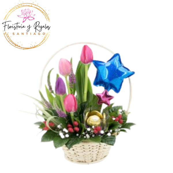 CANASTA DE 5 TULIPANES 1 BOMBON FERRERO ROCHER + GLOBO