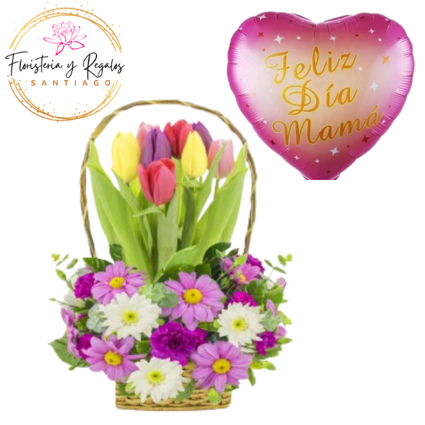 InicioFLORES Y RAMOS DIA DE LAS MADRES CESTITA 10 TULIPANES Y GLOBO