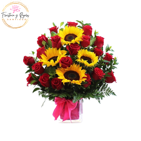 CUBO DE 20 ROSAS, 4 GIRASOLES Y FOLLAJE
