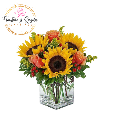 CUBO DE 6 ROSAS, 4 GIRASOLES Y FOLLAJE