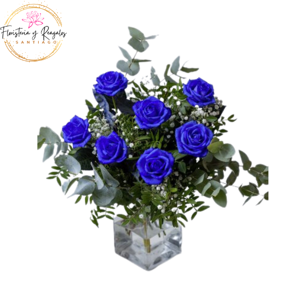 CUBO DE 7 ROSAS AZULES Y FOLLAJE