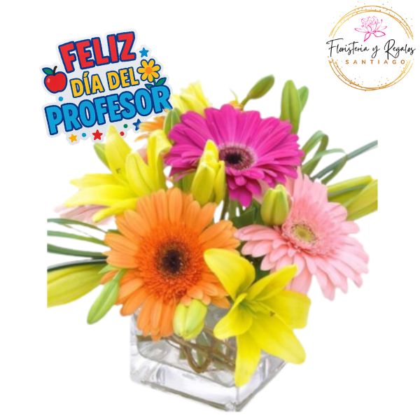 CUBO DIA DEL PROFESOR CON 3 GERBERAS, 4 LILIUM, FOLLAJE Y TOPPER