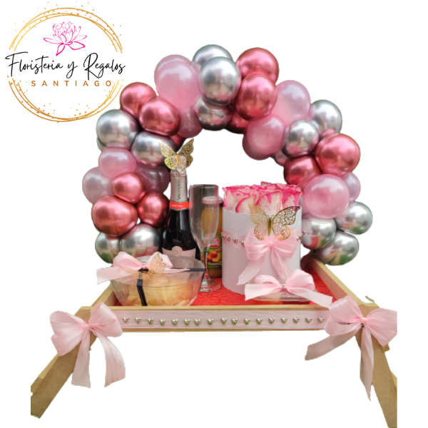 DESAYUNO ARCO DE GLOBOS + BOX FLORAL CHAMPAGNE DE 375ML JUGO Y PAN