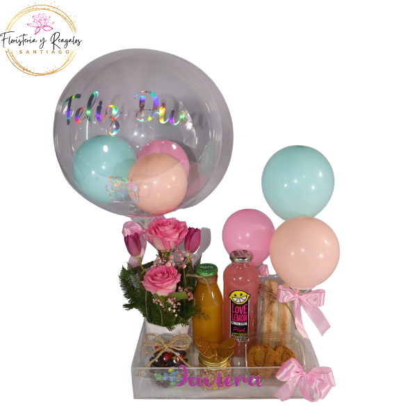 DESAYUNO EN BANDEJA ACRILICA CON PAN SANDWICH, BEBIDA, JUGO, GALLETAS, FRUTOS SECOS, TOQUE FLORAL, GLOBO BURBURJA Y DECORACION