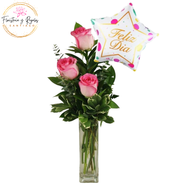 FLORERO 3 ROSAS Y GLOBO FELIZ DIA