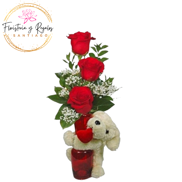 FLORERO DE 3 ROSAS GYSUM Y PELUCHE DE 20CM