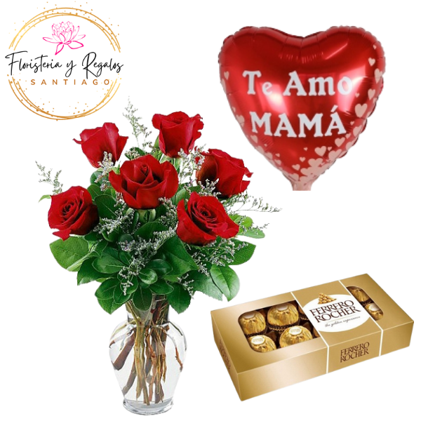 InicioFLORES Y RAMOS DIA DE LAS MADRES FLORERO DE 6 ROSAS + BOMBONES FERRERO 100G + GLOBO