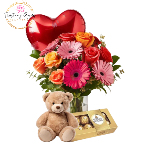 FLORERO VITACURA 6 ROSAS 4 GERBERAS PELUCHE 20 CM GLOBO Y FERREROS ROCHER 100G