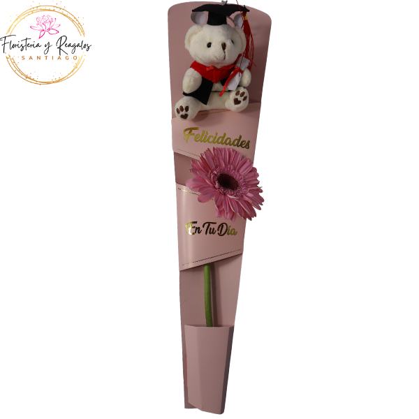 InicioGRADUACION GERBERA CON CAJITA FELIZ Y PELUCHE DE 11 CM
