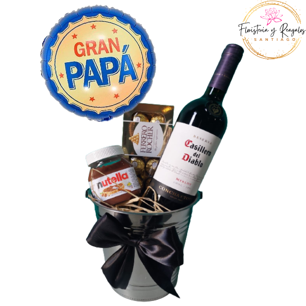 InicioREGALOS PARA HOMBRES HIELERA CON VINO, BOMBONES, NUTELLA Y GLOBO