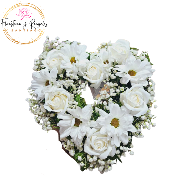 InicioFUNEBRES/CONDOLENCIAS MINI CORONA CORAZON 20CM DE 6 ROSAS ETERNAS Y MARGARITAS