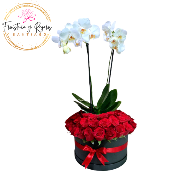 ORQUIDEA 2 VARAS EN ARREGLO FLORAL BOX 24 ROSAS