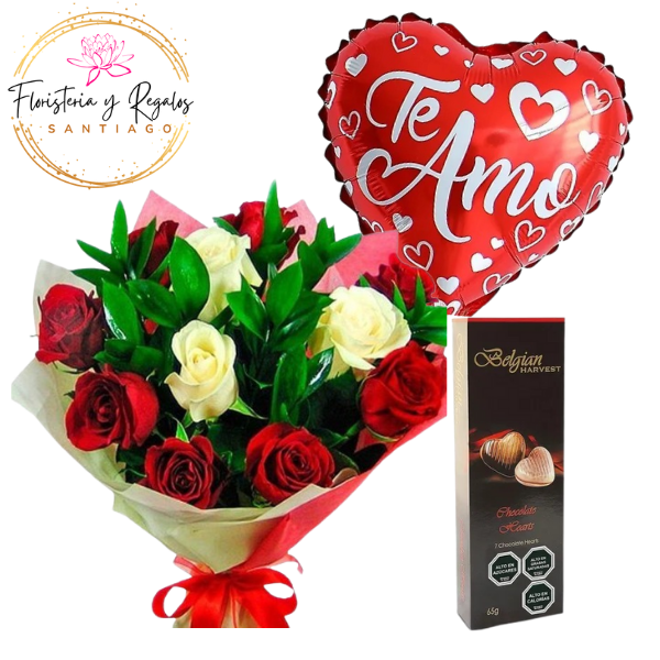 RAMO 12 ROSAS, BOMBONES BELGIAN Y GLOBO