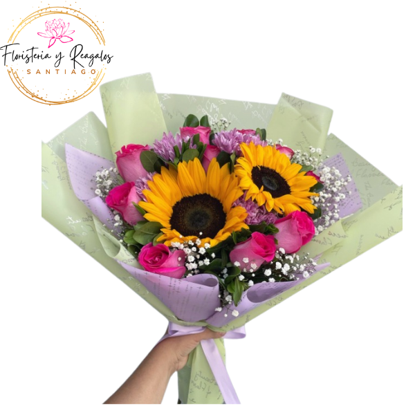 RAMO 2 GIRASOLES EN EL CENTRO BORDEADOS DE 10 ROSAS