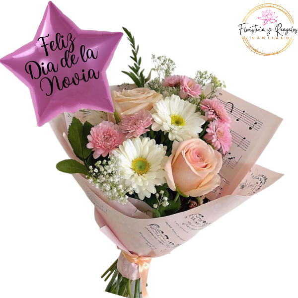 RAMO DIA DE LA NOVIA 2 ROSAS, 2 GERBERAS, MARGARITAS Y GLOBO