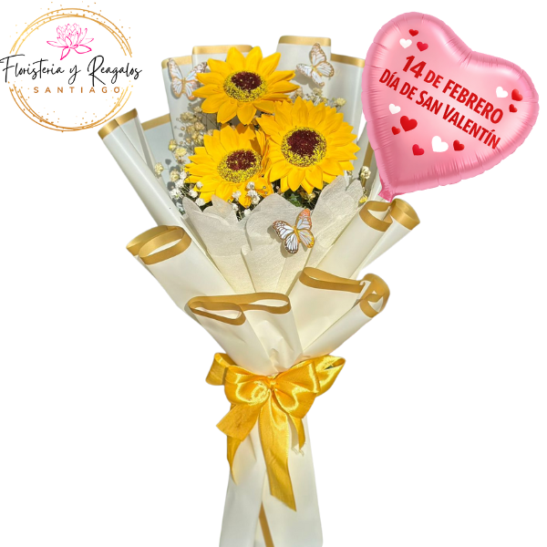 InicioDIA DE LOS ENAMORADOS MUJER RAMO 3 GIRASOLES JABON Y GLOBITO