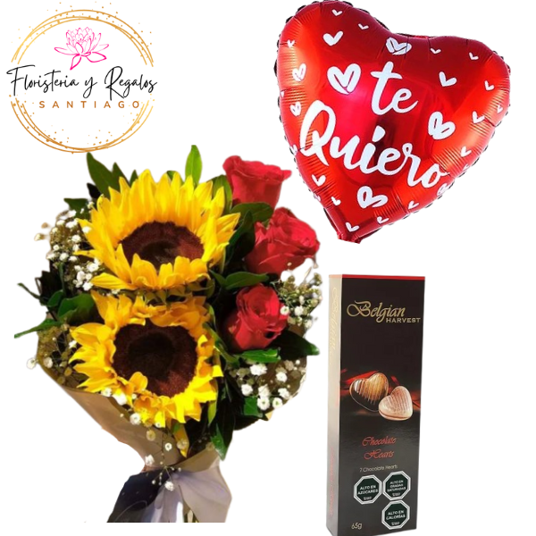 RAMO 3 ROSAS, 2 GIRASOLES, BOMBONES BELGIAN Y GLOBO