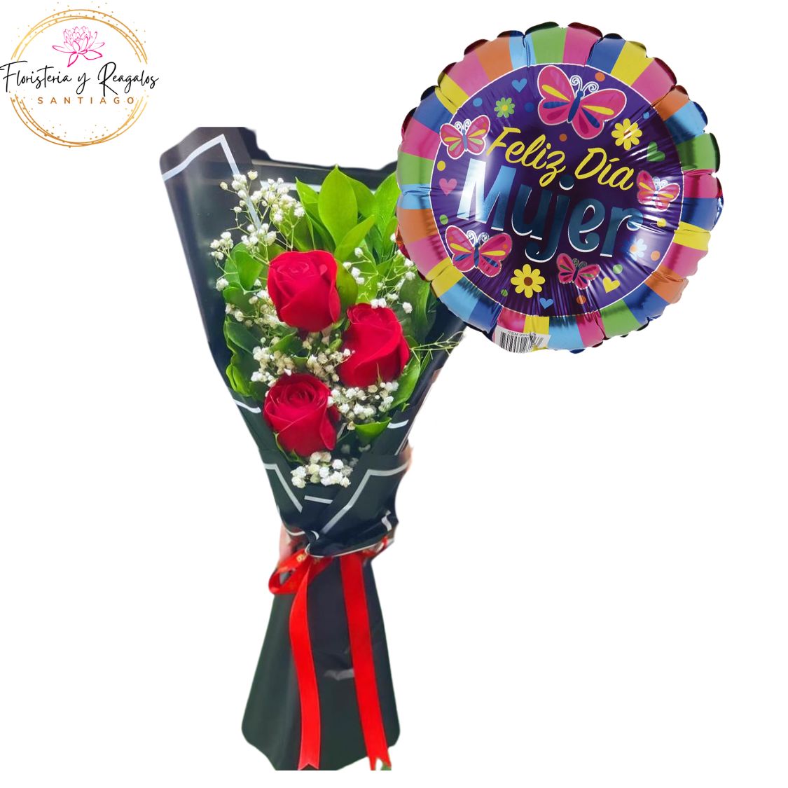InicioDIA DE LA MUJER RAMO 3 ROSAS, ENVOLTURA Y GLOBO