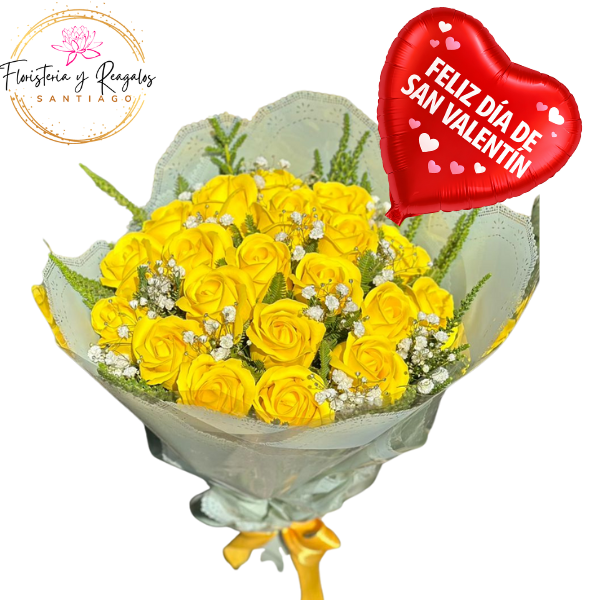 RAMO 30 ROSAS JABON AMARILLO Y GLOBO