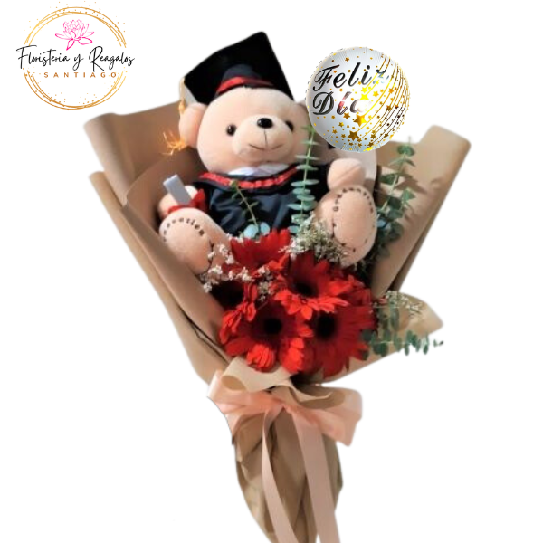 InicioGRADUACION RAMO 6 GERBERAS + PELUCHE GRADUACION Y GLOBITO