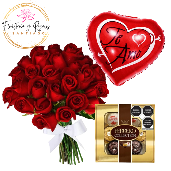 RAMO BOUQUET DE 30 ROSAS, FERREROS ROCHER COLECCION Y GLOBO