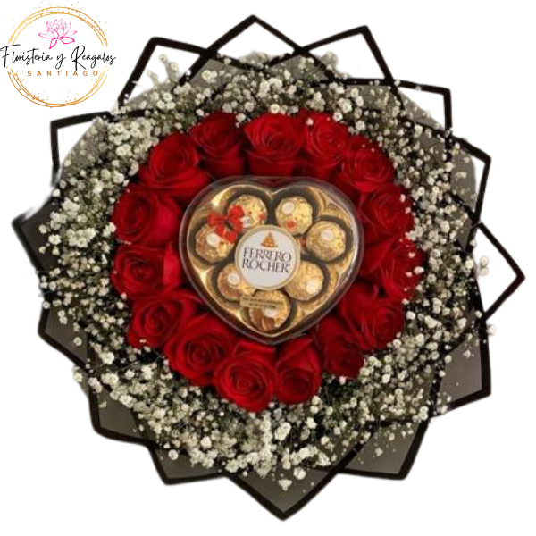 RAMO BUCHON DE 15 ROSAS IMPORTADAS, BOMBONES Y GYPSOPHILA