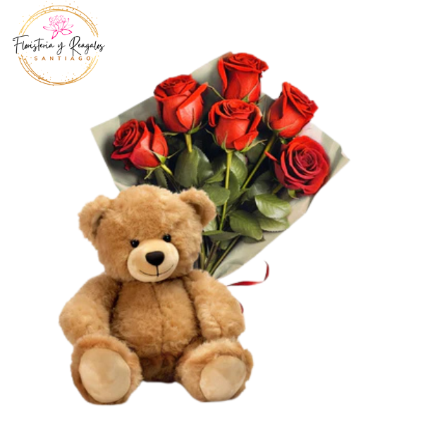 RAMO CONCHALI 6 ROSAS Y PELUCHE 25 CM