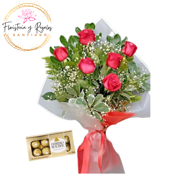 RAMO DE 06 ROSAS FOLLAJE E ILUMINACION + FERREROS ROCHER