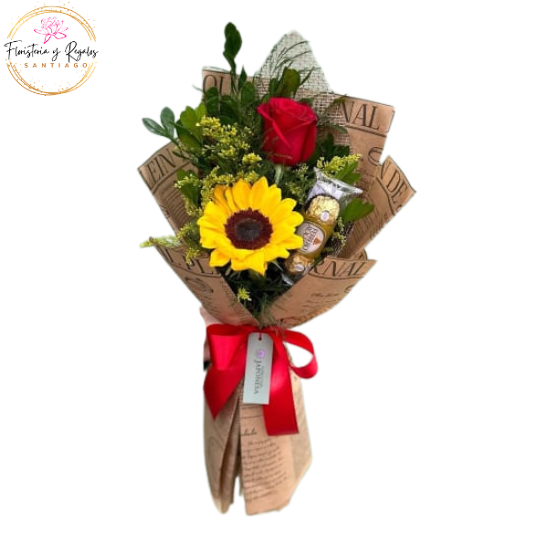 RAMO DE 1 ROSA, 1 GIRASOL Y BOMBONES FERREROS 3 UNID