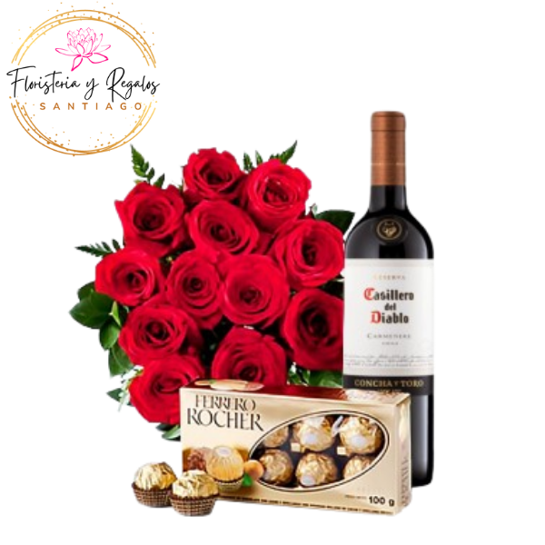 RAMO DE 12 ROSAS + VINO 750ML + FERREROS ROCHER DE 100G